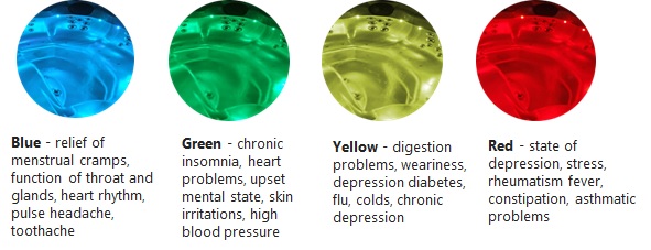 The Myline Spa moodlighting system is based on these 4 colours, each are reputed to help with the particular conditions below:-